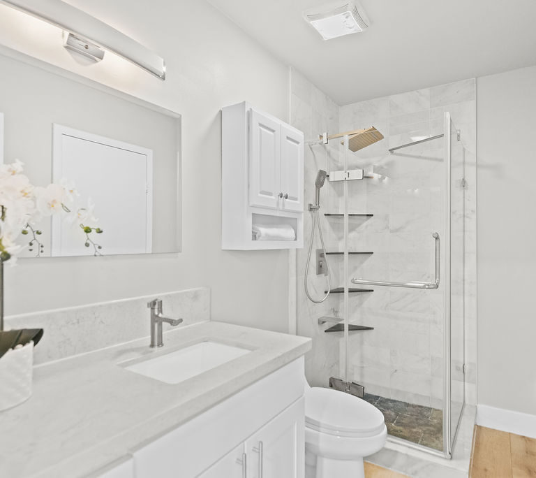 Step out onto the deep balcony with low-maintenance turf, ideal for relaxing or entertaining with room for outdoor seating. The updated bathroom features a sleek overhead rain shower for a spa-like experience.