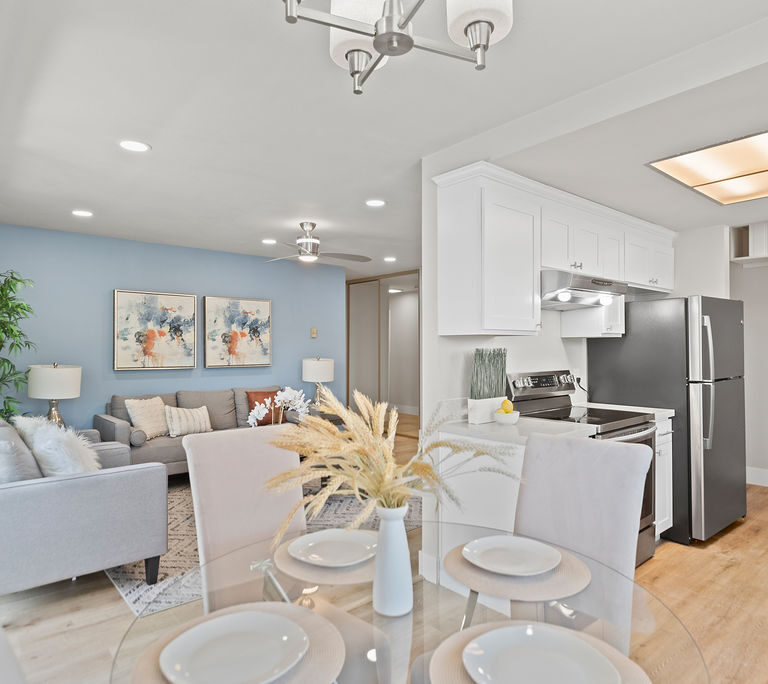 Inside, the bright kitchen features fresh white cabinetry and convenient dining nook. The open living area boasts light-colored flooring that enhances the natural light and further opens the room.